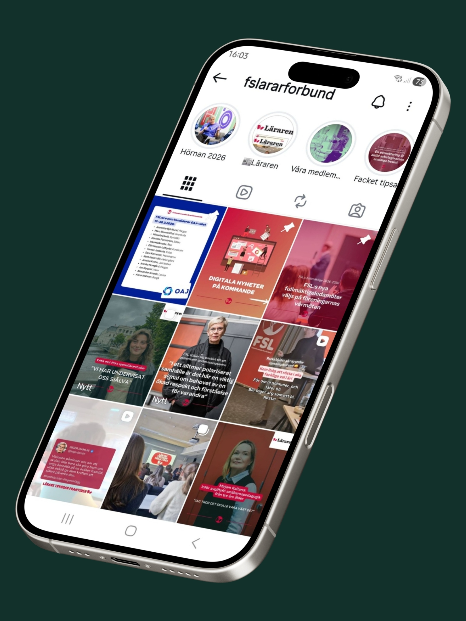Häng med oss på Instagram och Facebook där vi bjuder på relevant, roligt och regelbundet innehåll för dig som medlem och dig som är nyfiken på de finlandssvenska lärarnas och rektorernas arbetsvardag!